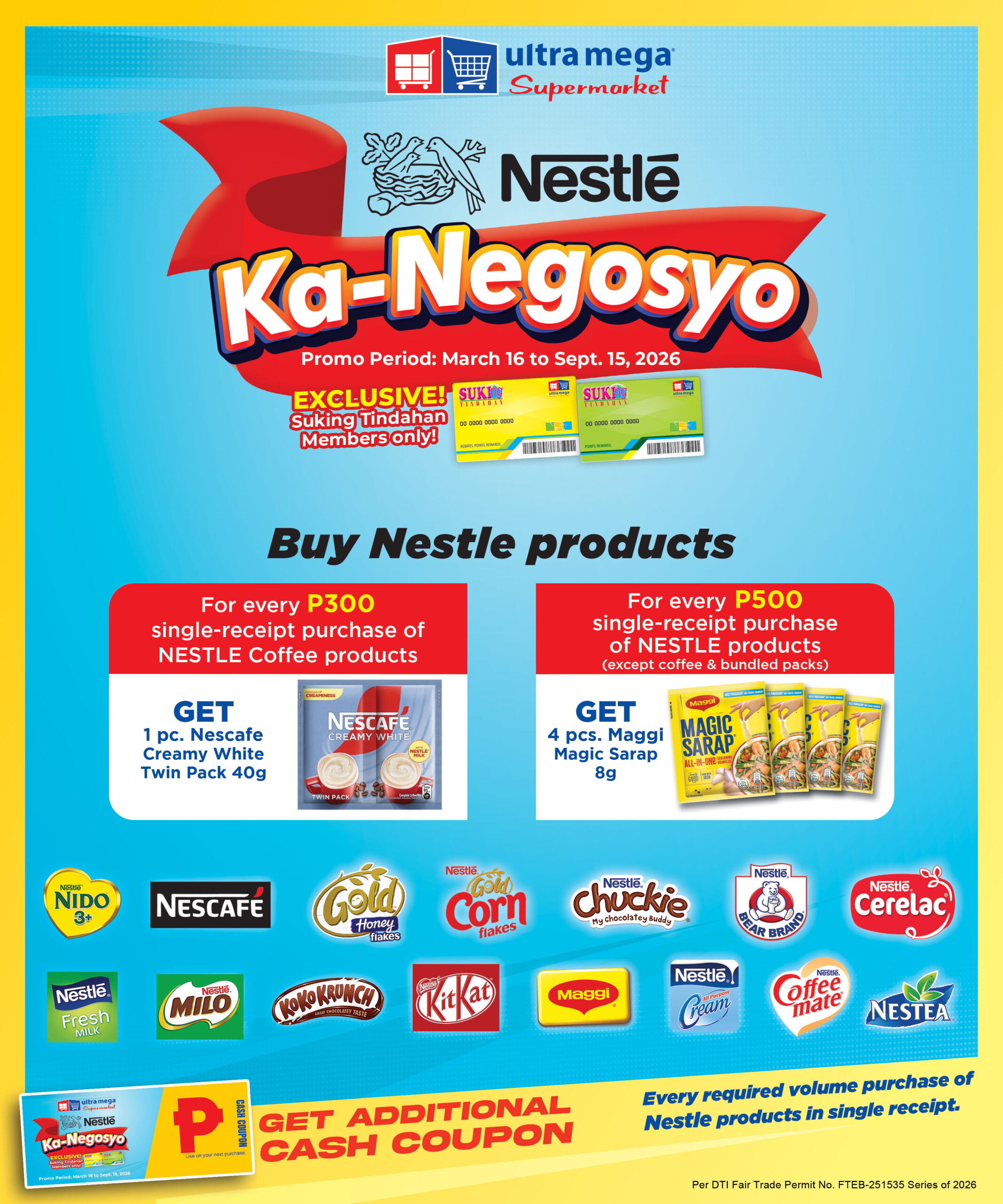 TITLE : Nestle KA-NEGOSYO PROMO PERIOD : March 16 to Sept. 15, 2026 BRANCHES : BALIUAG (GROCERY)BINANGONANCANLUBANG (GROCERY)CANLUBANG (SUP)GAGALANGINLEMERYSAN MIGUELSTA.IGNACIA (TARLAC)TANAY MECHANICS: Every P300 single-receipt purchase of Nestle Coffee products, get 1pc Nescafe Creamy white Twin Pack 40g. Every P500 single-receipt purchase …